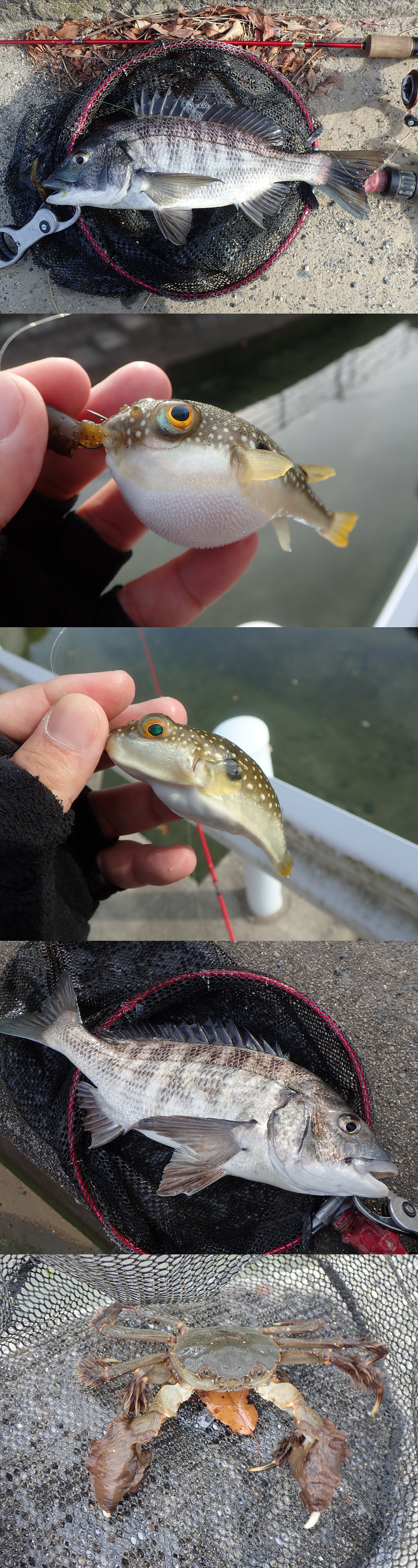 チヌ*6バイト4ヒット2キャッチ(40-45cm),モクズガニ*1,フグ*2